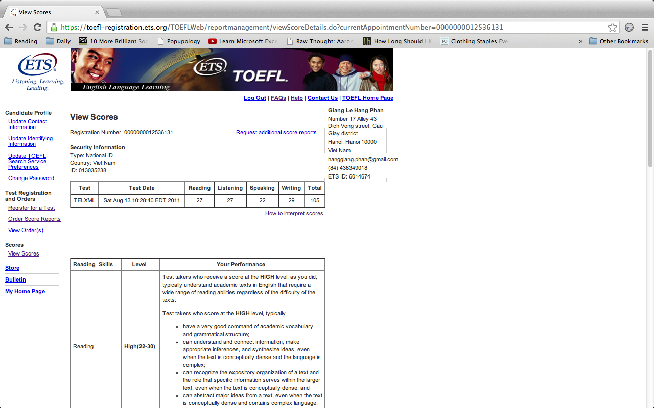 | 1 | Phan Lê Hằng Giang | TOEFL IBT 105/120 | Vào xem | |