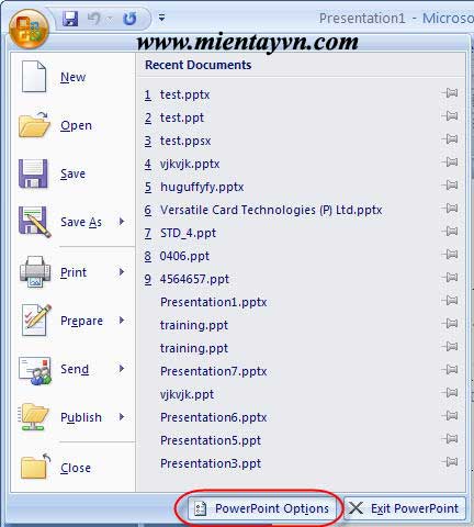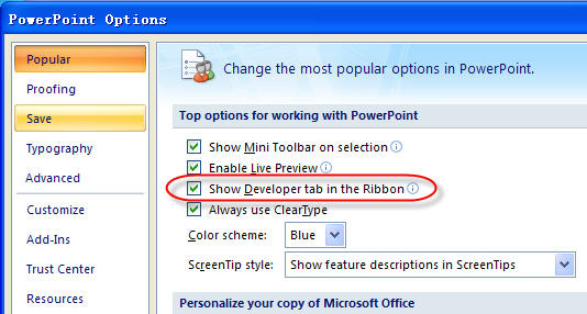 1. Click Microsoft Office Button ở góc trái phía trên cùng > click “PowerPoint Options” ở đáy của panel > đến cửa sổ của “PowerPoint Options” > click “Popular” ở cột trái > chọn “Show Developer tab in the Ribbon” ở cột phải > click “OK” ở dưới cùng.