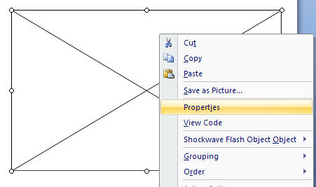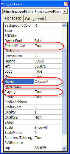 6. Để làm cho Flash tự động chơi khi slide được trưng bày, thiết lập tính chất của “Playing”“True“; Để embed Flash vào trong PowerPoint, thiết lập tính chất của “EmbedMovie”“True” (có thể bạn không cần thiết phải làm bước này)